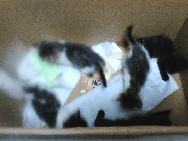 そのまま見過ごすわけに行かない。可愛い5匹だ。黒くてフサフサの毛の子。黒くて普通の毛の子。黒い子は目が綺麗なブルーだ。あとは、お母さん猫によく似た白地に黒のマダラ模様が適当にある子が3匹だ。みんな元気で、歯もしっかり生えていてさすがに、野良猫の母さんは素晴らしい。いまごろから飼うとよくなつくので良いと思いとここまで書いて何だかんだと忙しく、今になって公開。これは1日のものです。